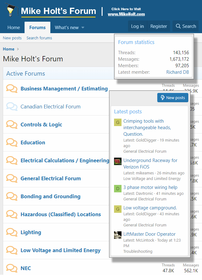 If you're not already a member, please take some time to browse this great FREE resource. When you do, you'll discover that the forum is simple to navigate because it's broken down into individual topics including Bonding and Grounding, Education, National Electrical Code, Safety and many more. You can even browse by latest posts so you can see what's trending.