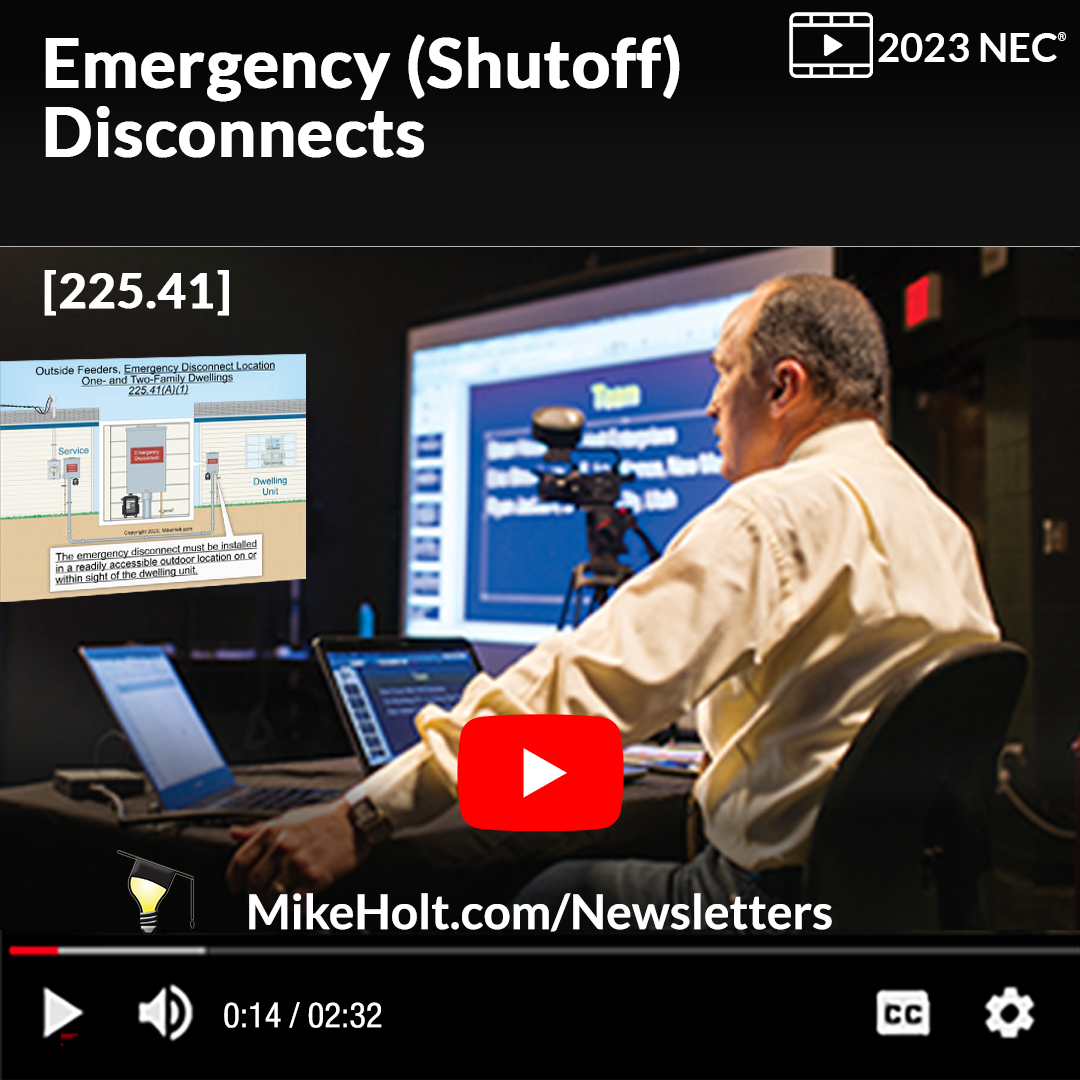 Code Video Series - Emergency (Shutoff) Disconnects [225.41], based on the 2023 NEC