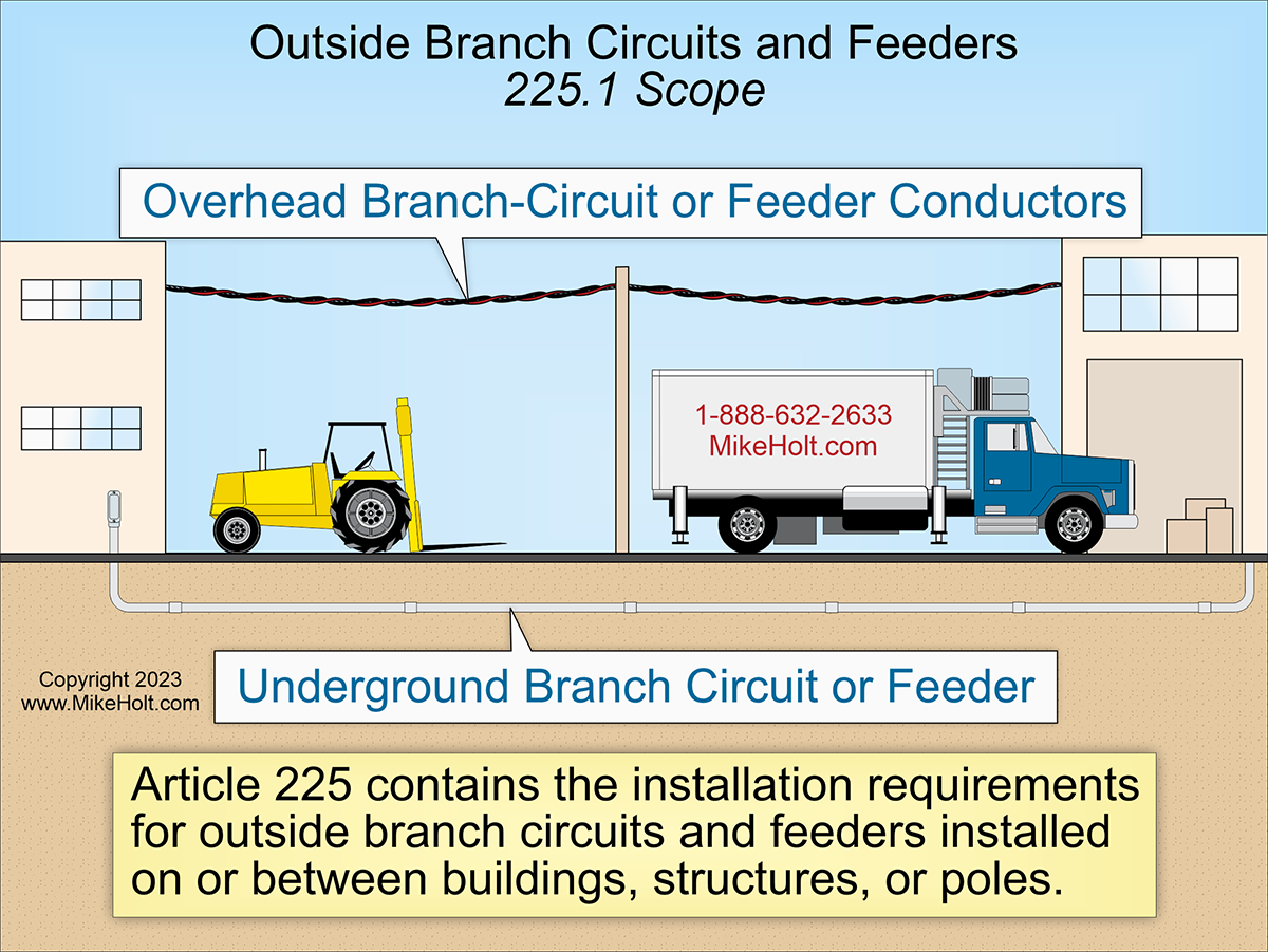 Article 225 contains requirements for outside branch circuits and feeders not over 1000V ac or 1500V dc, installed on or between buildings, structures, or poles. Figure 01