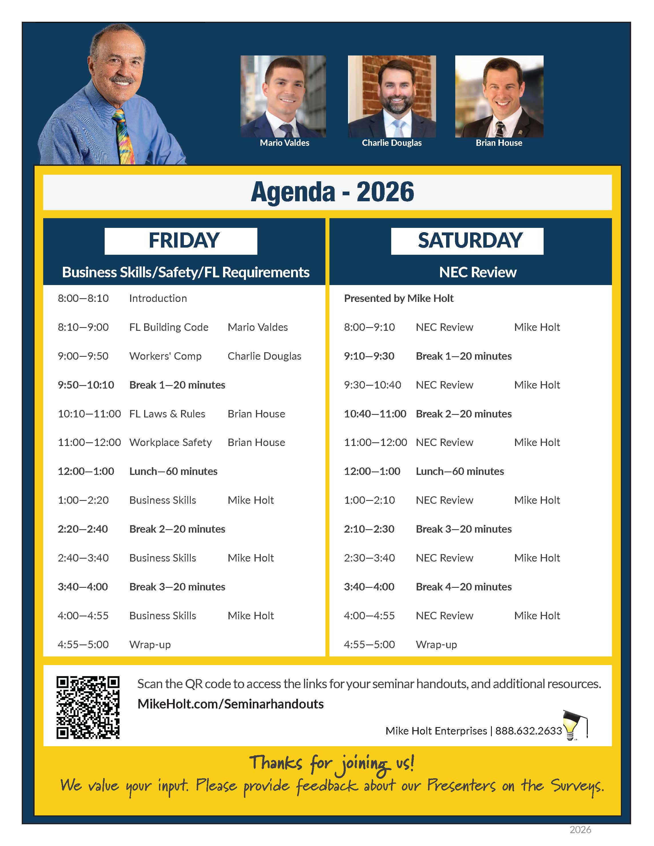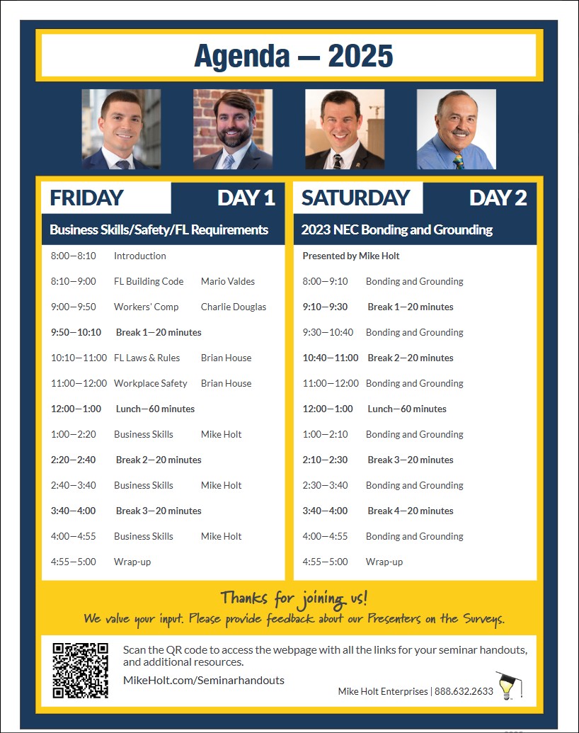 Advanced Code Module Florida Building Code Florida Electrical Contractors Licensing Board Florida Laws Chapter 489 Florida Statute 471.003 Engineering Limits Workplace Safety Resources Donnie's Accident OSHA E-Tool Safety Meeting Minutes [word] Safety partner Consulation Resources Mike’s Leadership Program Videos Orlando Presentation Evaluations Day 1: 2025 Business Skills Day 2: 2023 Bonding and Grounding Overall Seminar Evaluation 2023 NEC Bonding and Grounding